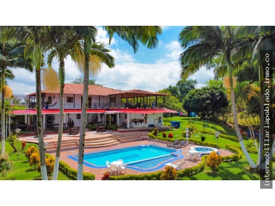 Área 44.500 m², construida 790 m², se vende amoblada, 11 alcobas con baño privado cada una, en total 12 baños, cocina integral totalmente equipada, parqueadero para carro amplio, pisos en cerámica, 2 kioscos, zona verde, piscina, jacuzzi, mesa de billar pool, mesa de ping pong, juegos infantiles, balcón y parqueaderos. Cuenta además con casa de mayordomos con 2 alcobas, 2 baños y cocina integral. Funciona como finca hotel, con capacidad para 42 personas aprox., cuenta con cultivo activo de aguacate de aproximadamente 300 árboles, tiene abastecimiento de agua caliente por medio de 10 calentadores solares. Ubicada por la vía Armenia-Montenegro, salida #2, vereda Santa Rita, kilómetro 4, con buen acceso de transporte, a 20 minutos de Armenia, zona campestre. Para mayor información, contáctanos al 3117706560. Intermobiliaria Poblado S.A.S.